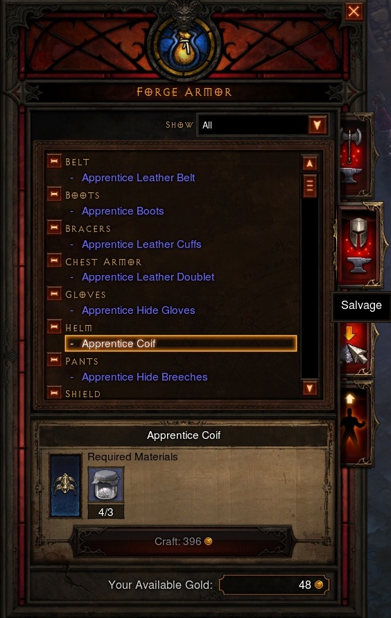 The crafting system changes a little as the only items you can break down for supplies are ones that are labeled as rare. In fact as far as I can tell, the only use for items that are not rare is a bit of extra money from selling them. This crafting system works by going to the blacksmith and giving him supplies to craft the items you have a recipe for. He also can be paid for training to increase what you can make at a crafting station.