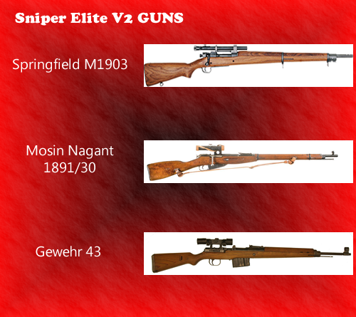 The guns they have available in the game are the Springfield M1903 (American), Mosin Nagant 1891/30 (Russian), and the Gewehr 43 (German). The submachine guns you deal with are the Thompson, MP 40, and the PPSH 41. These machine guns are great for the close combat when it has to get to that, but if you'r good at being sneaky and can take people out at a distance with the sound covers then you won't have to really need to use them. Pistols in the game include the British-made Welrod (supressed pistol), Colt 1911, and Luger P08. You would also obtain other weapons such things as Land Mines, Trip Mines, Grenades, and Dynamite. Other fun guns (if you pre-ordered the game) were the KAR98K, and the SVT-40. If you download the "Assassinate the Fuhrer" DLC, though, you will obtain both of those guns.