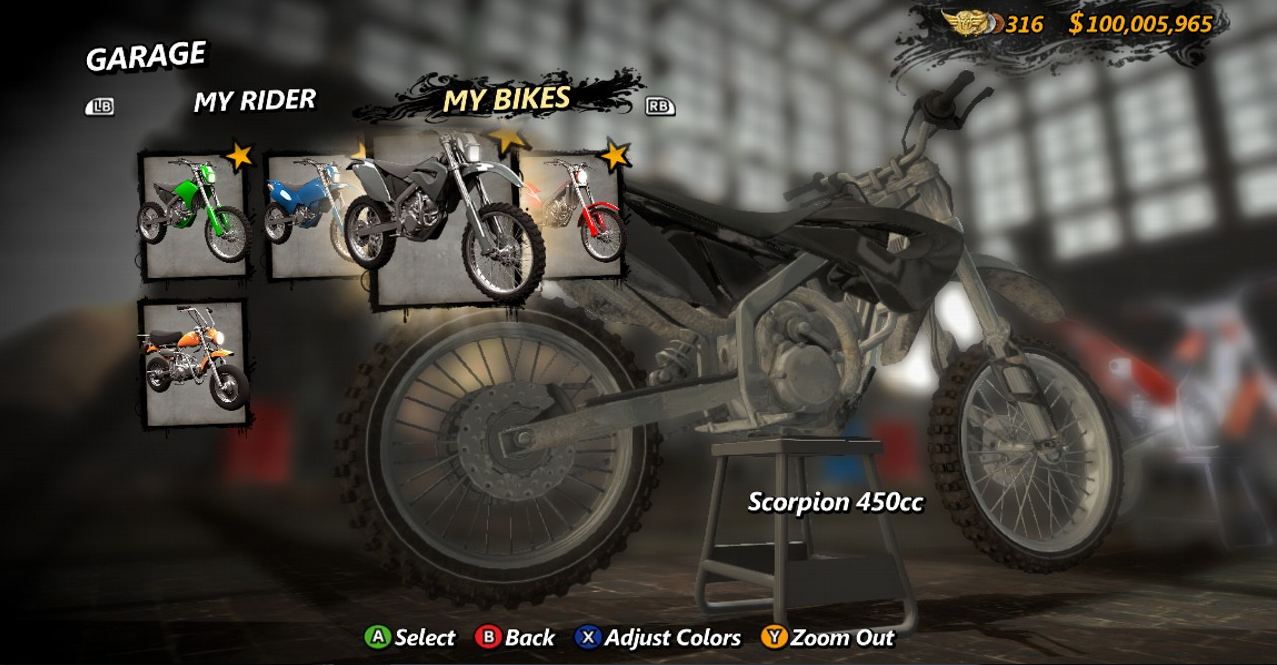 For your garage they have many great ways to customize your bike (along with your rider) to make him your own. The bikes you have are the Rattler 125 cc, Piranha 250 cc, Scorpion 450 cc, and Phoenix Evo 250 cc. They also brought back the very small and hilarious Micro Donkey 60 cc, which really can only be used in the beginning and a few of the easy maps. You can only unlock if you have obtained the Unyielding Achievement in Trials HD. For the regular bikes you have the lower-end ones for beginner and easy levels (Rattler and Piranha). They have low horsepower, so they can't get you anywhere on the extreme. When you get to the Scorpion it's like Heaven on earth, where it gives you the proper power to get through the courses. With the Phoenix you wonder why it has a 250 cc. That's because the design of the bike is for trials riding, where it has a longer, sleeker frame that contours to the objects that you have to jump across. This also makes this game strategic for using which motocross bike where.