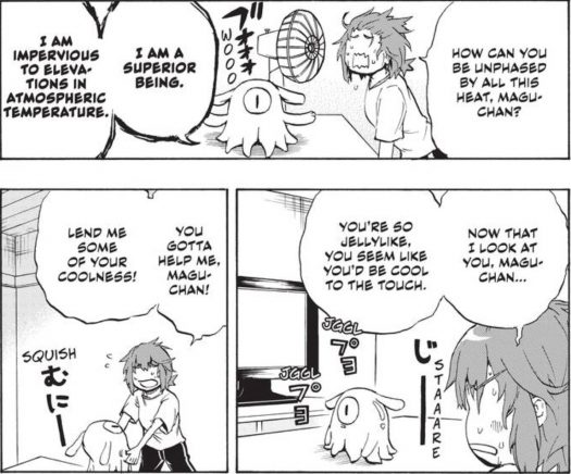 Perhaps the sweetest chapter involves Ruru falling ill, with Magu-chan taking care of her and her usual daily chores. As the middle schooler isn’t accustomed to ask for help, almost all of those in her circle wish to do all that they can to nurse her back. But leave it to the pink blob to not only go the extra mile to care for Ruru, but do so without messing anything up! (Well…okay, his laundry skills need working.)
