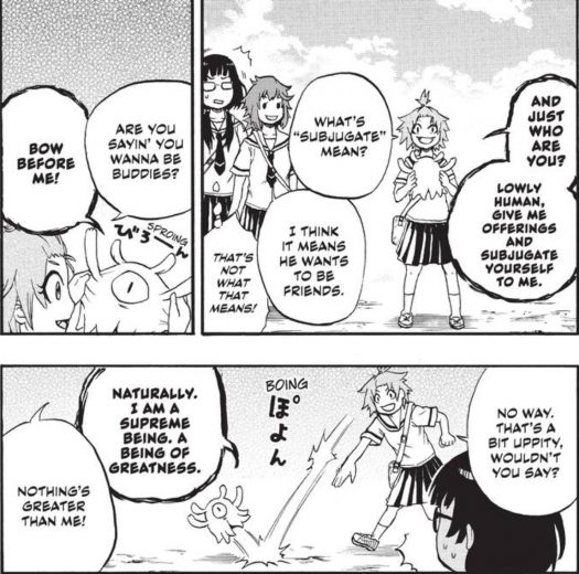 One chapter involves Magu-chan finding a stray dog in the cold heavy rain. Although he’s the evil one, it’s Ruru that winds up having to play the bad guy when it comes to keeping pets. But with his ability to talk to the pup, Magu-chan gets to have his own animal minion and have fun with it…temporarily, that is. When his time with the animal comes to an end, the god finds himself sulking in a kind of adorable fashion!