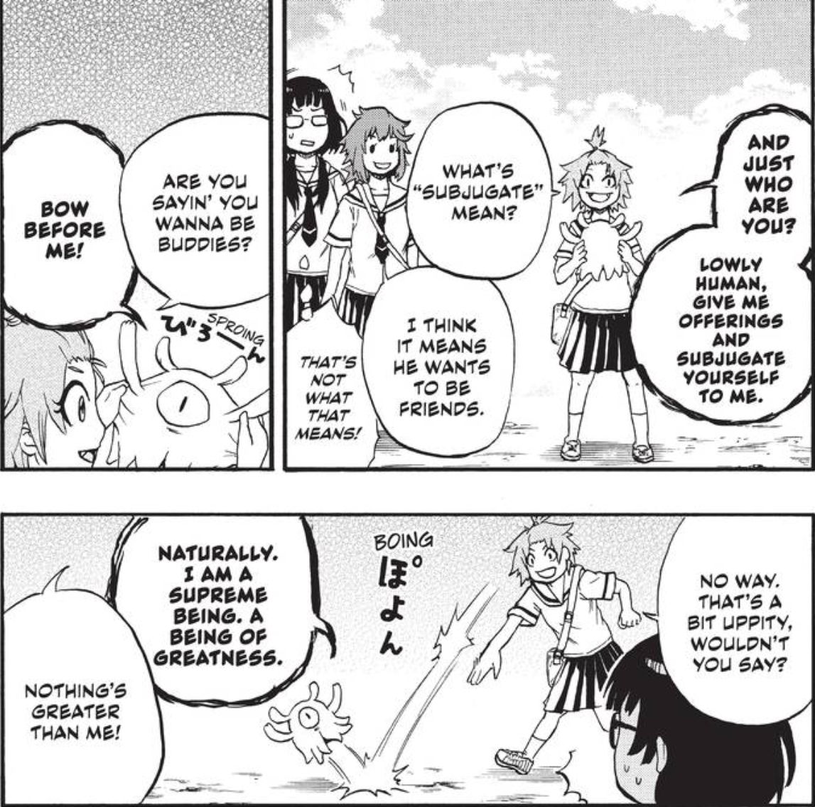 While the first volume of Magu-chan: God of Destruction did well with the world-building, it didn’t exactly add anything new to the invader comedy formula. Thankfully, unlike a series like Sgt. Frog, our titular character is the sort who has his cake and eats it gleefully. Despite the lack of total victory over the humans, Magu-chan chalks up tiny wins here and there in fun fashion. Whether it’s a fight against Izuma or a climbing contest with Yuika, the tiny god finds a way to not only win the fight, but also the friendship of almost everyone he crosses paths with.