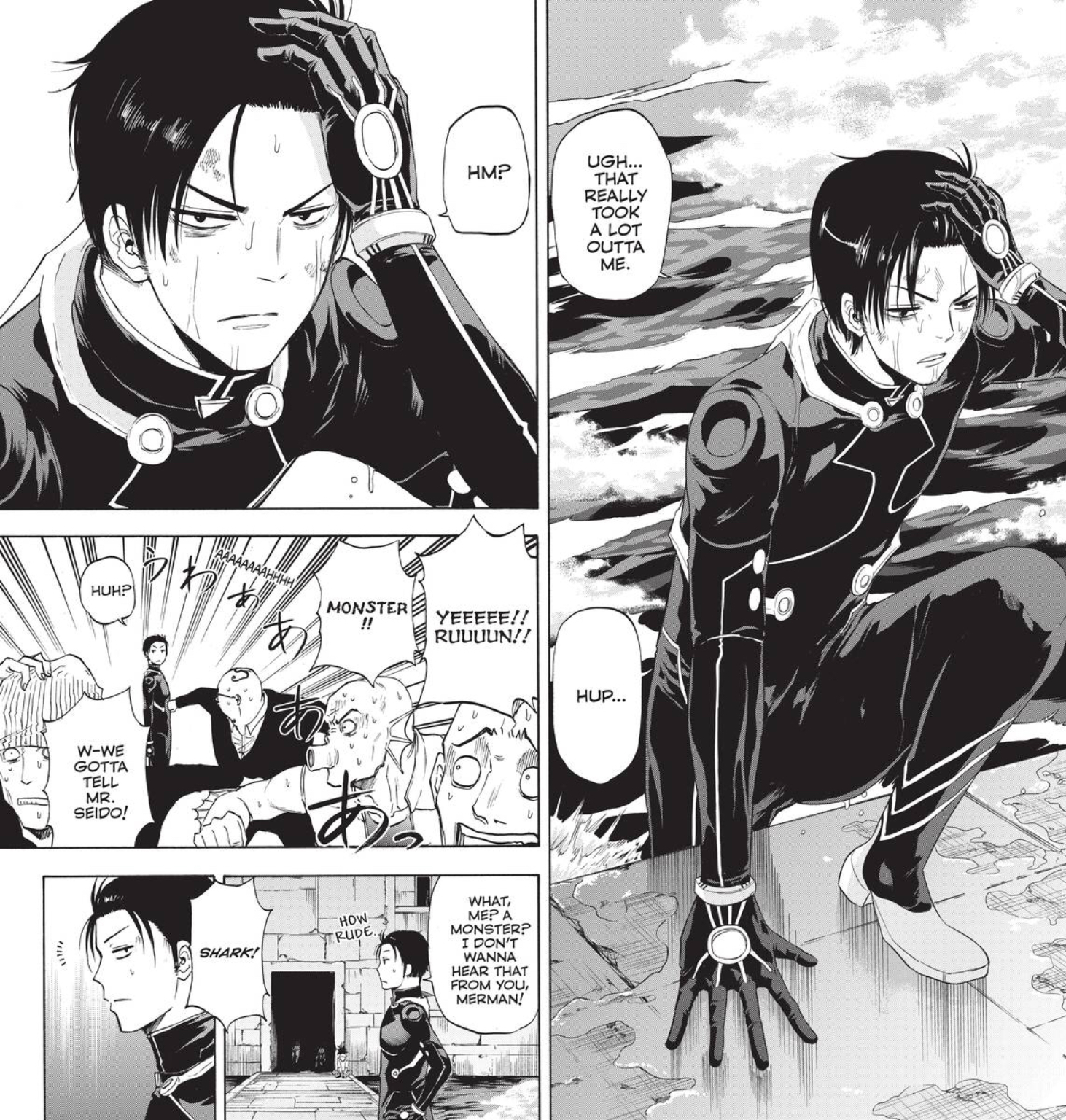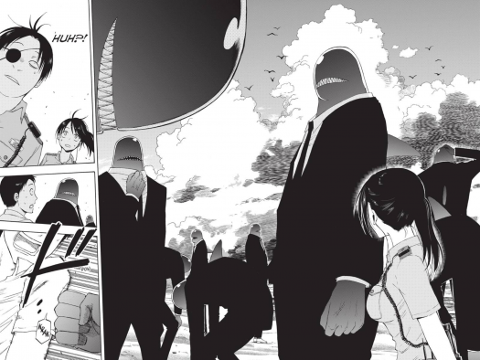 Speaking of art style, Tamura brings in the creepy when seeing the false killer whales to humanoid form. I’m not exactly sure if he’s read the works of Sam Kieth, but their sharp fangs and eyeless expressions brought to mind the Iszes of The Maxx. It’s a page that left me staring at the art for a few moments, as it brought a terrific level of threatening vibes to their appearance. Of course, like an Isz, they do wind up being easy to handle when you know where to strike them down.