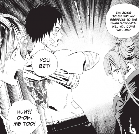 Which leads to the next faction for the trio to conquer next. The Emma Syndicate has a large gang size to deal with, but its leader Kotton winds up having past ties to Urara’s father. At first, it looks like it’ll be an easy partnership…until Kotton tells Urara to ditch her comrades. Naturally, that’s a big “NO” for the future leader, and it results in a very stylistic fight between Kotton and Kaido. But the big surprise comes from Ten, who manages to figure out some pretty neat tricks to hold his own. You know, once his head stops spinning like a Harley Davidson wheel driven by a Hell’s Angel.