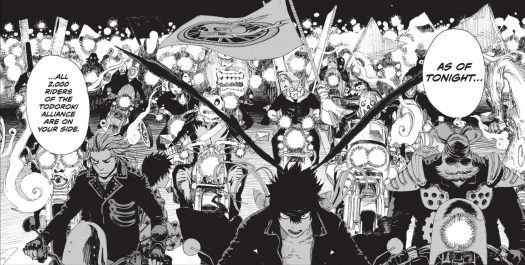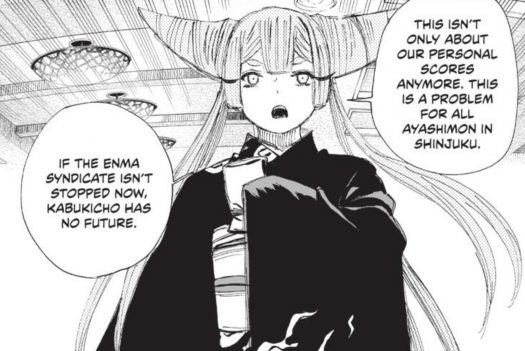 This is where Urara shines as both a leader and a fighter. Even when she’s told to stand down and leave Kabukicho, her face and words hold a demeanor that demonstrates her will to win and survive. It’s even more impressive seeing her keep her cool when she and her cohorts find themselves stuck in a tower made out of a ballsack, a sight that made me wince just a bit when I saw just how detailed Kaku made certain…things. Thankfully, Maruo arrives in the nick of time for the battle to commence.
