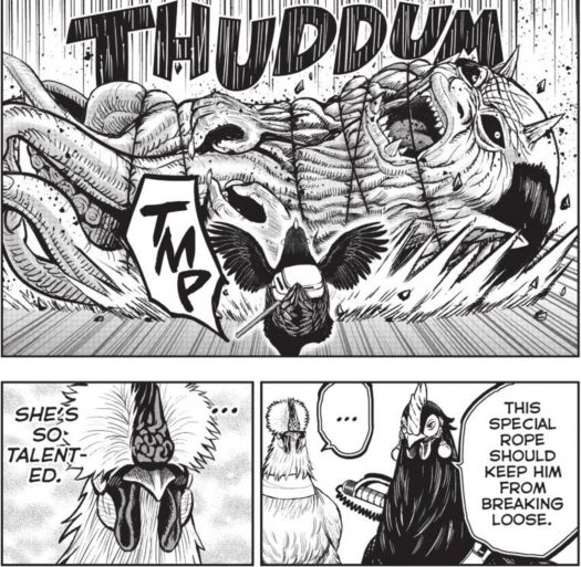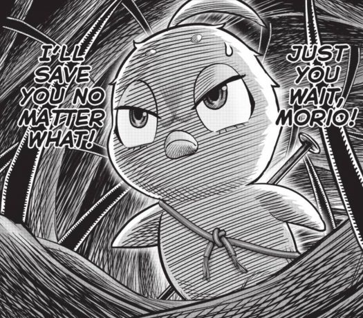 However, the real MVP of this volume of Rooster Fighter is none other than Chicken Little. The small chick conjures up an idea, resulting in her going inside of Morio to deal with his problem. No matter how frightened she gets, Chicken Little swallows her pride and tackles the nasty critter that’s causing Morio so much pain. But then, a moment we all wish wouldn’t happen…does.