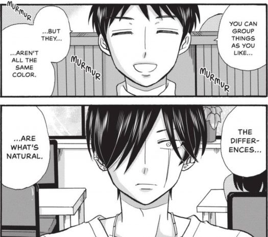 At first, Aono has no idea why he needs to learn about colors in the first place. But thanks to his dedicated teacher, he not only learns why, but he comes up with his own logical reasons. The calm blanketed with blue, the warmth in a hint of orange, love surrounded by red. Aono dives so much into the color of feelings, that Morio unlocks a new appreciation for the life around him.