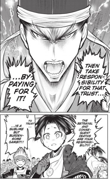 Even before they draw swords, a battle occurs between Hojo and Tadayoshii. For the first time since the first volume, Hojo is treated as a child. And to be fair, he’s eleven, so he obviously should be treated as one. But this is a kid who has grown into the fighter that he is now, and the words that Tadayoshii attempts to sway to Hojo will not damper his spirits. With that, the true battle begins.