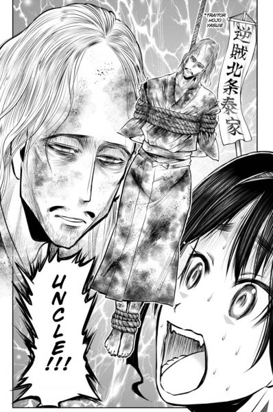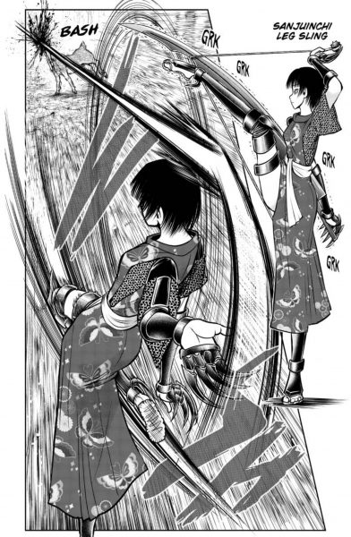It’s a good thing readers get some slick weaponry to watch in action, because Tokiyuki will need it. Once again, he’s trying to win back Kamakura, after swearing allegiance to Go-Daigo’s southern court. But when Hojo Yasuie is held captive by the enemy, Tokiyuki has two choices: surrender or watch his uncle die. Naturally, he takes the third option: fight commanding general Shiba Magojiro.
