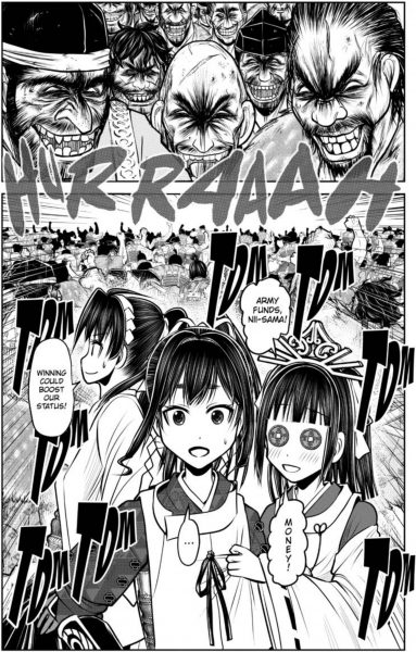 Yet again, before it comes time for another battle, new weaponry must be made. Whether it’s some modifications for leg blades or a club that’s as good for killing as it is for fishing, these showcases are a prime example of why Matsui is one of the best artists in manga today. However, while his drawing skills are top-notch, it’s his knack for comedy that’s bar none hard to top. A discussion between the ladies of the Elusive Warriors leads to thoughts on marriage, concubines, and…adult fun time. I won’t say more in fear of spoiling the best gags.