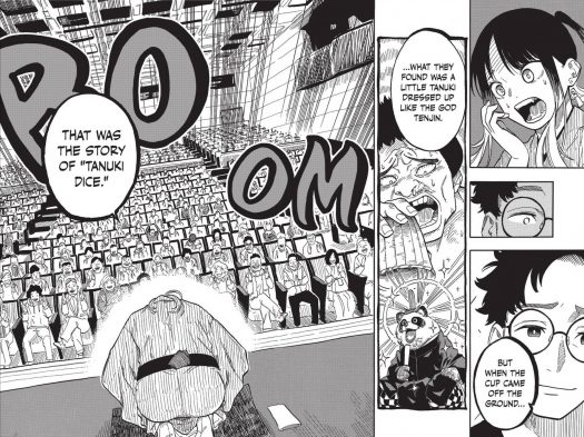 Things have kicked off at Asagao’s futatsume promotion, with Akane telling the tale of “Tanuki Dice”. But her own promotion is on the line too, with Arakawa Arch Four member Taizen there to watch her do her thing. But with a certain Afro-haired member already telling Taizen not to promote her, it seems like fate has already made its roll. Fortunately for Akane, the loaded dice is in her favor.