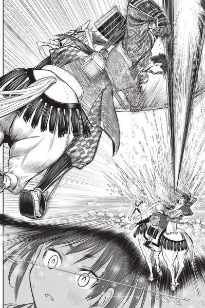 The same can be said for the multitude of battles that occur in the second half of the volume. We once again have Sadamune going one-on-one with Tokiyuki, with both showcasing their strengths with the bow-and-arrow. This fight gets so heated that it forces the bug-eyed enemy to whip out his secret technique, one that seemingly takes Tokiyuki out of action. Thankfully, that’s not the case, and how he’s able to survive is too good to spoil here.