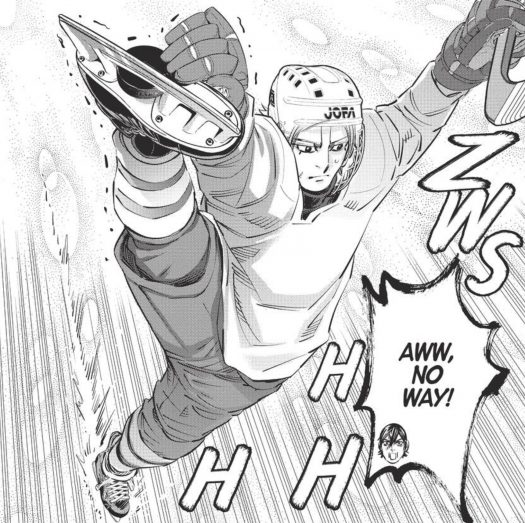 But when practice hits the ice, we see why Rou is almost already at a pro level of hockey. His moves make him a master of offense and (most) defense, as he shows the other teammates why he may already be the top dog. And speaking of top dogs, that dog of a Coach Nihei may have topped Rou’s mom once, a fact that leaves the former figure skater projectile vomiting more than Linda Blair. (Props to author Satoru Noda for making this particular scene more hilarious than gross, a daunting task if there ever was one!)
