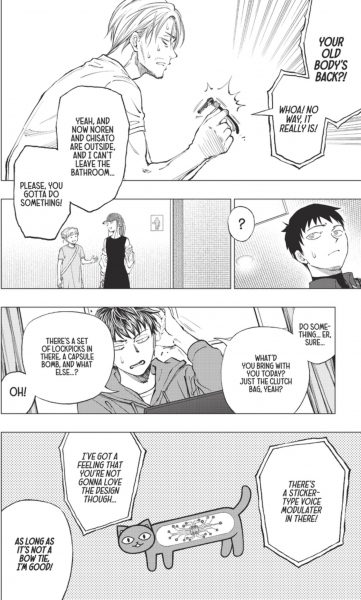 Now the bad news: Noren’s been abducted…again. This time it’s a pair of brothers, one of whom looks a bit stitchy to be fully alive. Now Juzo, with the aid of Tenma, must rescue Noren from the hitmen siblings. Oh, and did I mention this mission involves exploding golf balls and a hypnotic lighter?