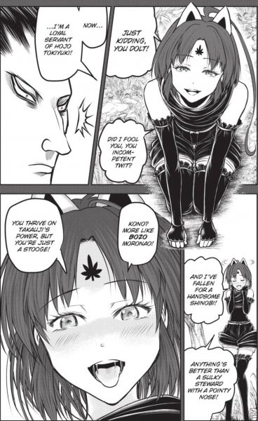 Natsu and Genba have a fun moment in this volume of The Elusive Samurai. The master of disguise ruins any chance for Natsu to return to her previous lord, and he does so in the nastiest of ways. But it’s a good thing that he did, as the Elusive Warriors have proven themselves to be a much better, caring group of people than the Ashikaga. So thankfully, Tokiyuki didn’t lose two allies in his current journey.