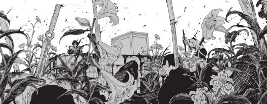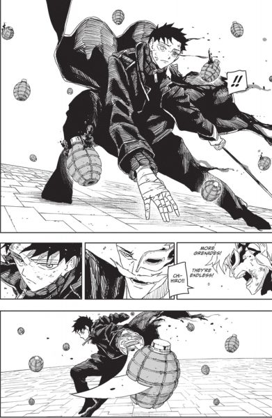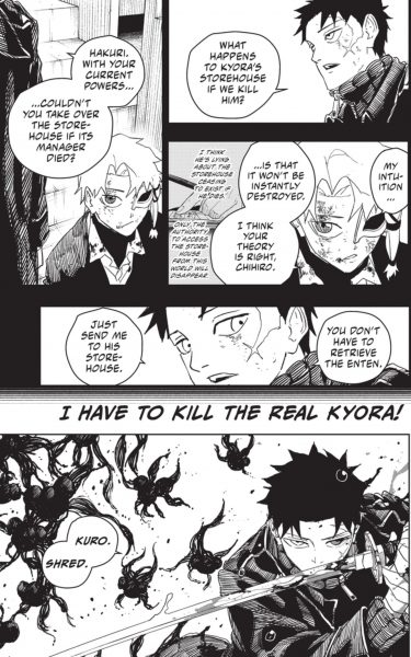 It’s here where we see just how good of a manga artist Hokazono can be. The fight between Chihiro and Kyora is intense, with both men giving just about everything they go in order to overpower the other. On top of that, the brutality of the weapons powers aren’t ever held back, with many men overpowered by vines growing out of their bodies. You almost feel bad for them, until you remember that they’re there for an illegal auction, so they’re more and less trash!