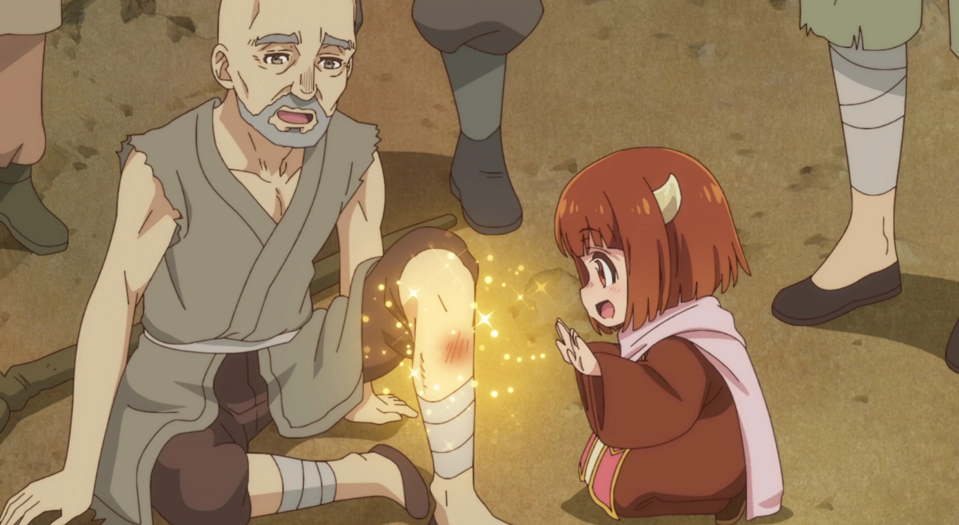 Each episode of The Demon King’s Daughter is Too Kind!! follows a basic formula. First, either Ahriman or Jahi gives Doux an evil task. But then, Doux takes the evil task and flips it on its head. What was once a wicked plan instead transforms into a heartfelt act of charity and, in a couple of cases, heroism! So whenever Doux shows up in the areas her father has conquered, she’s never met with fearful stares or citizens trembling in their boots; she’s met with smiles and hugs!