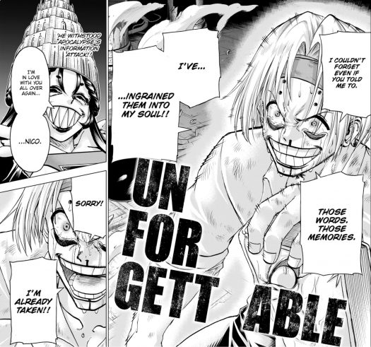 Enter the Negator Language, who is in her Second Phase. She takes away many of the Union members’ voices, leading to the next big battle: her against Nico. One problem: because he’s had no tragedy in his life, Unforgettable has yet to manifest in Nico. Language is furious, to the point of attempting to end Ichico’s life to bring it about. Thankfully, Ichico’s got herself a sick power that will keep death from happening to her.